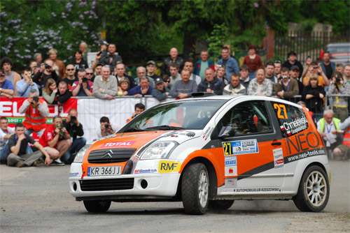 Niestety pierwszy rajd w sezonie zakończył się dla nas pechowo. Popełniłem głupi błąd – za późno zaczęliśmy hamować na śliskiej kostce do patelni w Walimiu i wypadliśmy z trasy tuż przed metą os Rościszów. Mimo to pierwszy dzień rajdu mogę zaliczyć do udanych. Dzięki drugiemu miejscu w klasie i nowemu systemowi punktacji, udało nam się zdobyć 7 cennych punktów w klasyfikacji R2B oraz 2 punkty w klasyfikacji generalnej, co naprawdę dużo dla mnie znaczy. Dodatkowo cieszę się z wizyty oraz przekazanych nam wskazówek przez Simona Jean Josepha oraz Samuela Barraud z Citroen Racing.
